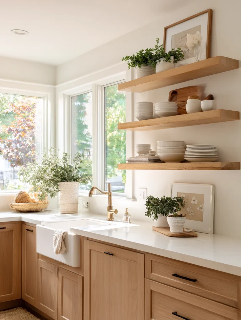 Why this works: Open shelving above the sink lets you display your prettiest dishes while keeping them accessible for daily use. It makes the kitchen feel more open and less boxy than upper cabinets. And it forces you to keep things tidy, which, honestly, helps with the whole “organized kitchen” thing.