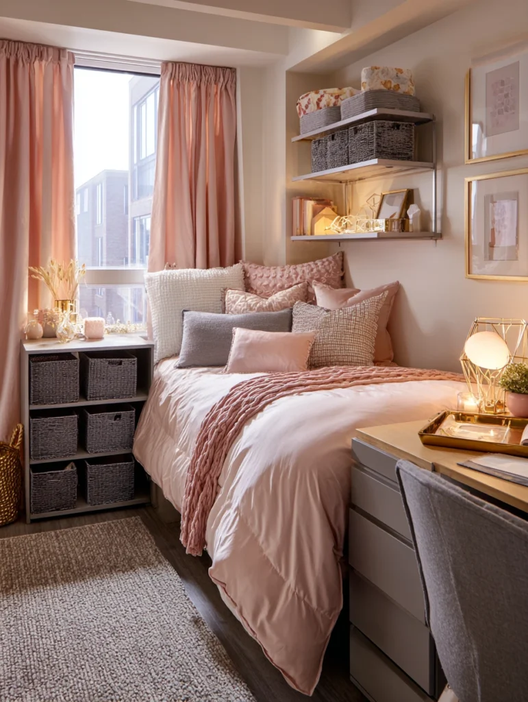 Romantic and Luxe: Dusty rose is like blush pink’s more sophisticated older sister – it’s got depth and personality without being too sweet. Add gold accents and suddenly your dorm room feels expensive and put-together. This combination is perfect if you want something feminine that doesn’t scream “teenage bedroom.”