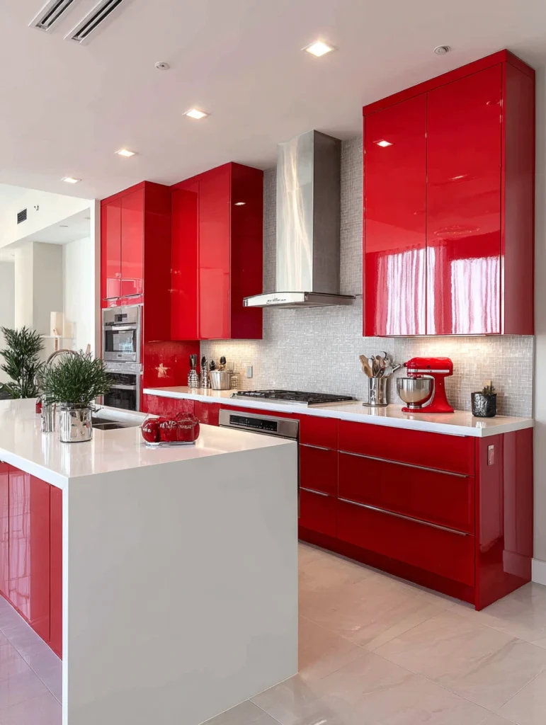 1. High-Gloss Red Cabinets That Shine