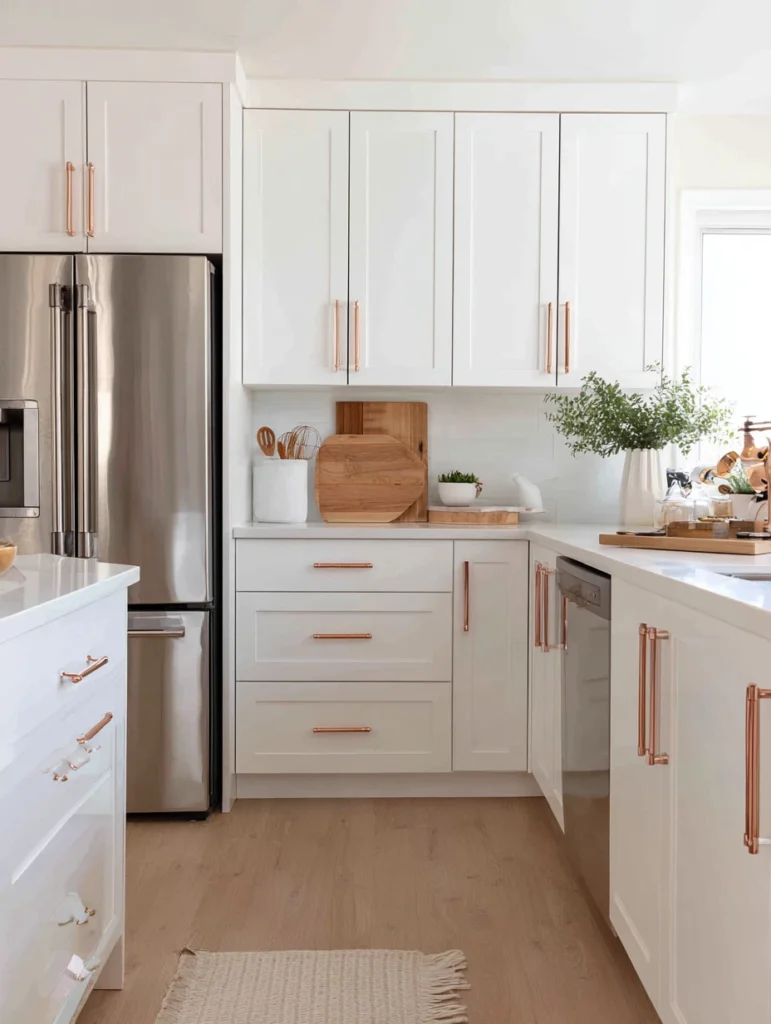 Why This Works: Swapping your cabinet knobs and pulls to rose gold instantly warms up the room and makes even basic cabinets look intentional. You turn flat, cold doors into something that feels a little more polished and cozy. Honestly, it feels like your kitchen put on jewelry, and it shows.